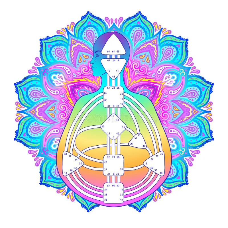 La charte du Design Humain comporte neuf centres, chacun représentant un aspect de votre être (pensée, émotions, communication, intuition…). Certains sont définis (colorés) et indiquent des énergies stables, tandis que les centres ouverts (blancs) montrent des zones de sensibilité, influencées par l’extérieur.